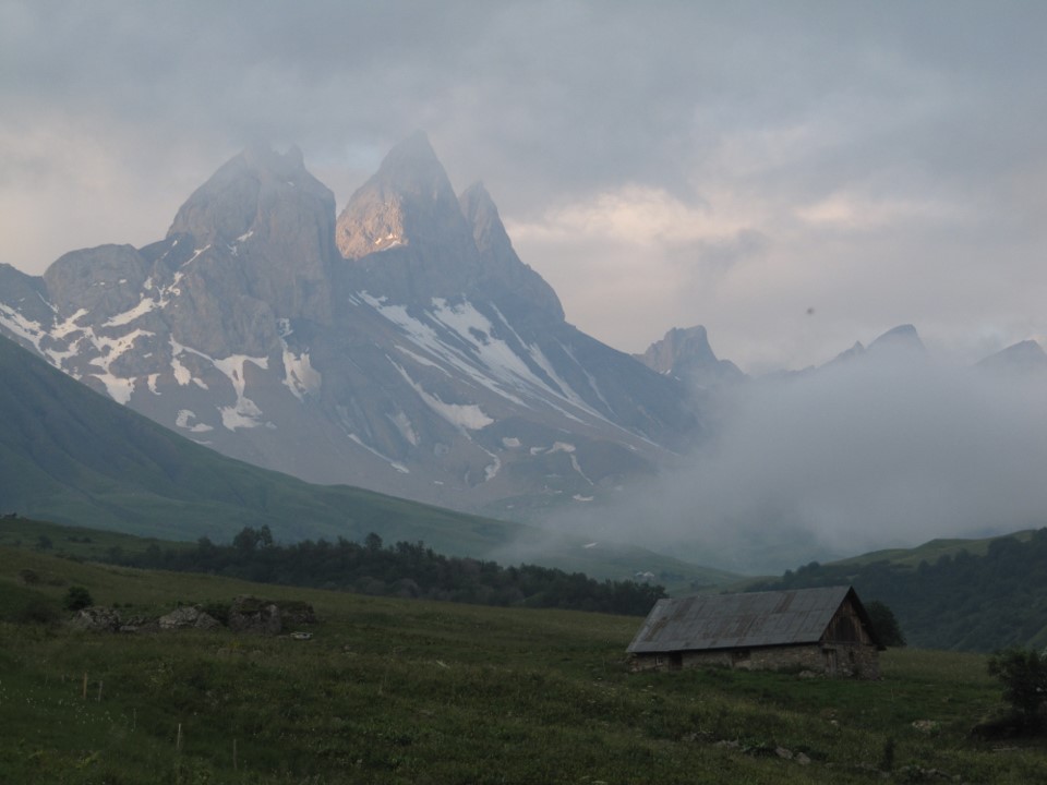 Het opvallende silhouet van de drie pieken van Les Aiguilles d'Arves, boven Albiez-Montrond.